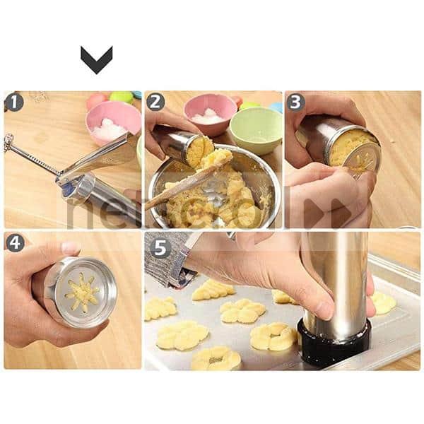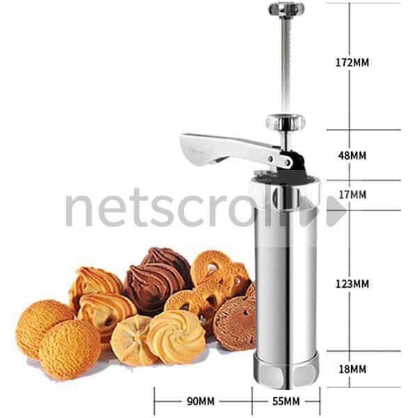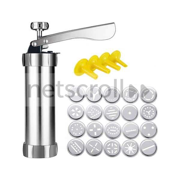 - Paket vsebuje: 1x pripomoček za izdelavo popolnih piškotov, 20 modelčkov za 20 različnih oblik piškotov, 4x šobe za iztis okrasne mase, 1x navodila za uporabo