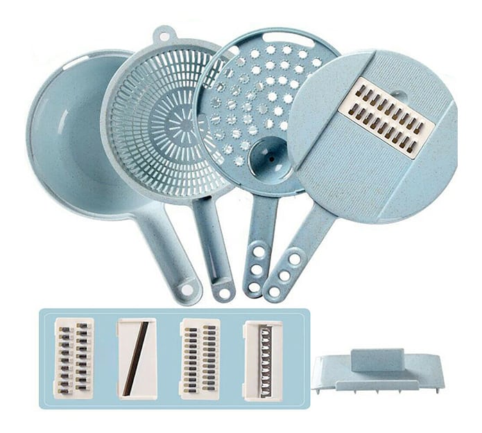 • 4 X rezila, 1 X zabojnik za shranjevanje, 1 X zaščita za roke, 1 X odcejalnik, 1 X rezalnik, 1 X ločevalnik jajc