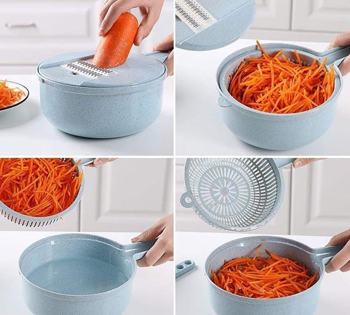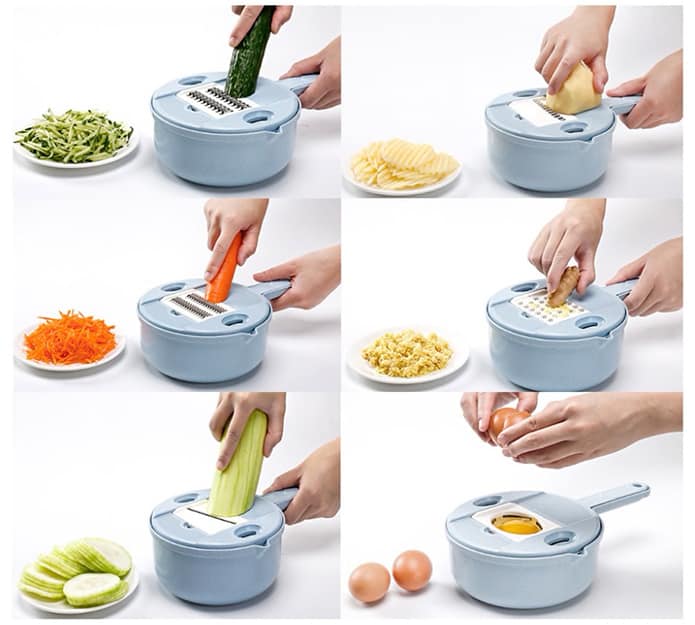 Praktično oblikovanje devetih kuhinjskih pripomočkov v enem omogoča prihranek pri stroških nakupa, varčujete s prostorom v kuhinji, privarčujete pa tudi čas za pripravo hrane, ker imate vsa potrebna orodja pripravno na enem mestu. Prihranili si boste tudi solze pri rezanju čebule, saj bodo rezine čebule padale direktno v zaprto posodo, ki se praktično namesti na pokrov z rezili.