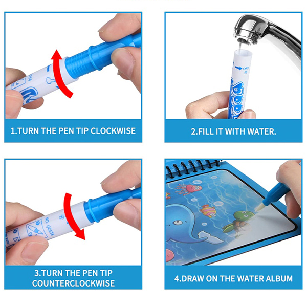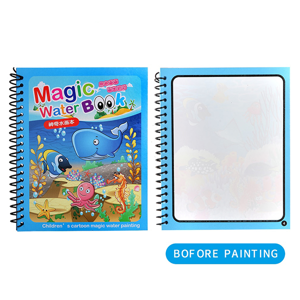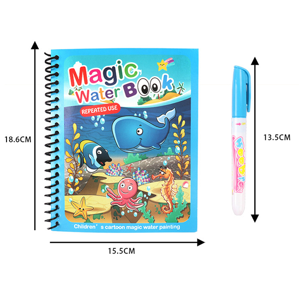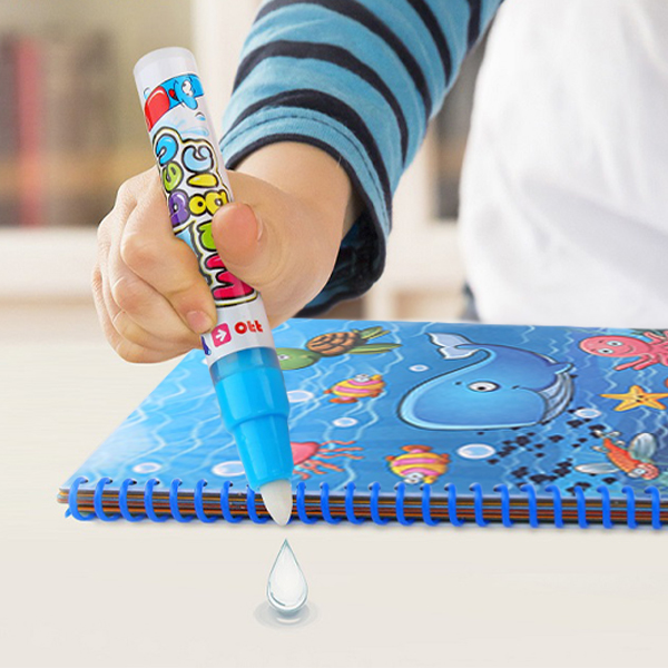 Inovativne vodne pobarvanke brez packanja! Vse, kar potrebujete, je le nekaj kapljic vode s katero napolnite magično pisalo in ustvarjanje se lahko začne! Barvanje z magičnim mokrim pisalom odkrije čudovite ilustracije podvodnega sveta, živali in otroških aktivnosti! Ko se slika posuši ilustracija izgine in pobarvanka je pripravljena za ponovno uporabo!