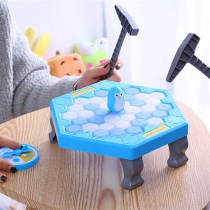 Skrbno sestavimo zaledenelo jezero in ga postavimo na priložene podstavke. Pingvin Kid čaka na sredini jezera. S kladivci previdno razbijamo ledeno površino po navodilih ledenega smerokaza, ki nam pokaže, katero barvo ledenih kock moramo razbiti. Kdor prvi izbije Kidu tla pod nogami, je poraženec in igra se lahko začne znova! Popestrite svoj prosti čas z razburljivo družabno igro, ki navdušuje najmlajše in mlade po srcu vseh starosti! Podarite svojim otrokom svoj čas in druženje ob zabavni družabni igri Pingvin Kid na ledu!