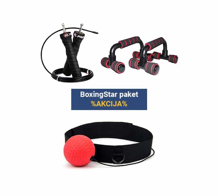 Naši najbolj priljubljeni pripomočki za vadbo boksa doma so sedaj združeni v paket BoxingStar! Popoln paket omogoča učinkovito vadbo za tehniko udarcev, kondicjio in moč v udobju vašega doma! V paketu prejmete BoxingBall, sistem za domači trening hitrosti, koordinacije in udarcev, ProJump kolebnico za vrhunsko kardio vadbo in ProHold pripomoček za izvajanje sklec. Drage članarine, omejeno gibanje in pomanjkanje prostora in denarja za domačo vadbo- vse to z 1 nakupom reši paket BoxingStar!