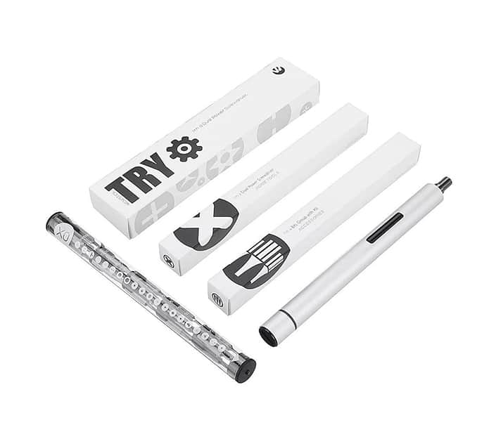 Komplet poleg električnega izvijača vsebuje tudi priročno tubo v kateri je lično shranjenih 18 različnih nastavkov za navijanje, etui iz blaga za shranjevanje vrtalnika in nastavkov, ter belo potovalno škatlico. Na dlani boste vedno imeli rešitev za zagate pri popravilu računalniških ali strojnih elementov.